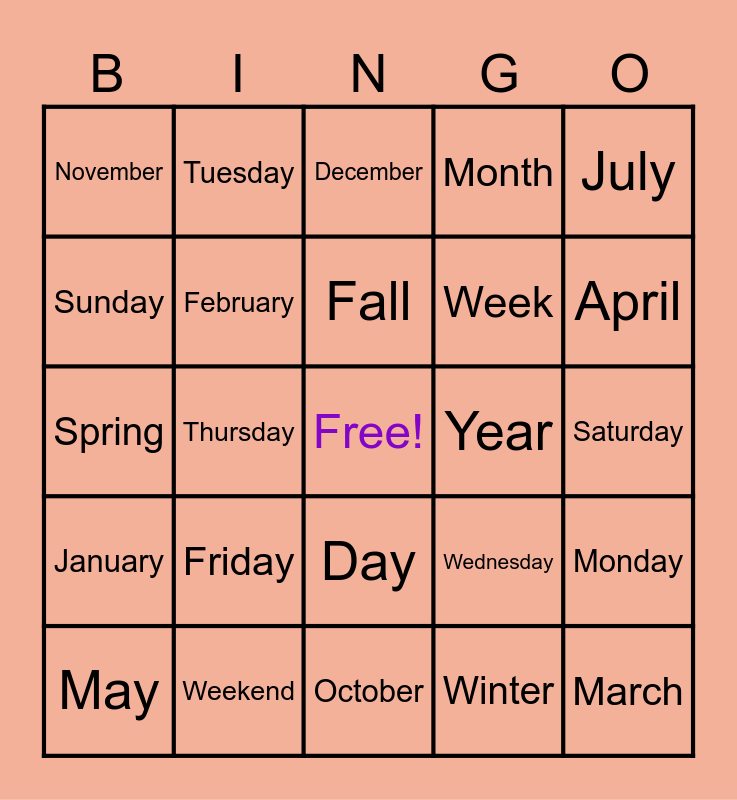 This bingo card has a free space and 28 words: Monday, June, Week, Winter, Sunday, December, Tuesday, January, Year, May, Spring, Month, Weekend, October, April, August, Friday, February, Fall, Day, November, Summer, March, Thursday, Saturday, Wednesday, July and September.