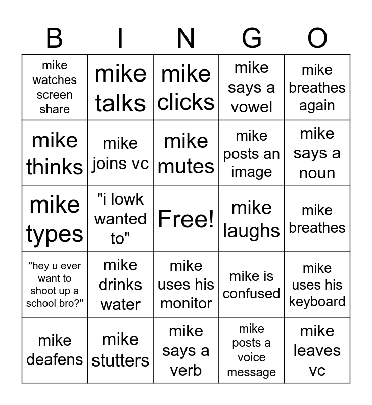 This bingo card has a free space and 24 words: mike drinks water, mike stutters, mike mutes, mike deafens, mike breathes again, mike watches screen share, mike thinks, mike talks, mike laughs, mike uses his monitor, mike posts an image, mike types, mike is confused, mike uses his keyboard, mike joins vc, mike posts a voice message, mike breathes, mike clicks, mike says a noun, "i lowk wanted to", mike leaves vc, "hey u ever want to shoot up a school bro?", mike says a vowel and mike says a verb.