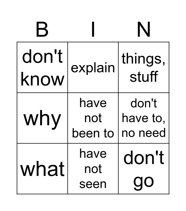 This bingo card has 9 words: what, things, stuff, explain, why, don't know, don't have to, no need, have not been to, don't go and have not seen.
