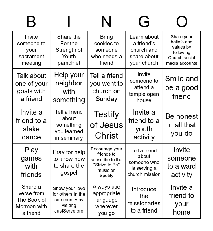 This bingo card has a free space and 24 words: Pray for help to know how to share the gospel, Show your love for others in the community by visiting JustServe.org, Tell a friend you went to church on Sunday, Share a verse from The Book of Mormon with a friend, Share your beliefs and values by following Church social media accounts, Invite someone to your sacrament meeting, Talk about one of your goals with a friend, Share the For the Strength of Youth pamphlet, Invite a friend to a youth activity, Encourage your friends to subscribe to the "Strive to Be" music on Spotify, Invite someone to attend a temple open house, Invite a friend to a stake dance, Tell a friend about someone who is serving a church mission, Invite someone to a ward activity, Help your neighbor with something, Introduce the missionaries to a friend, Be honest in all that you do, Bring cookies to someone who needs a friend, Smile and be a good friend, Tell a friend about something you learned in seminary, Invite a friend to your home, Play games with friends, Learn about a friend's church and share about your church and Always use appropriate language wherever you go.