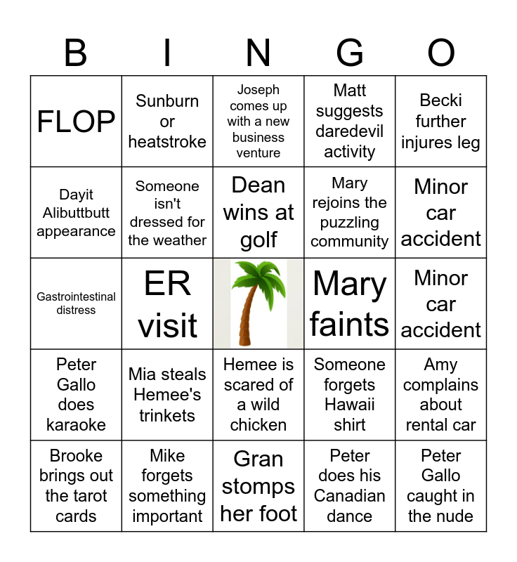 This bingo card has a free space and 44 words: Amy finds a store she likes and visits it daily, Peter Gallo caught in the nude, Caroline or Jake orders from the kids' menu, Brooke brings out the tarot cards, Julie does the BYU Coed, Peter does his Canadian dance, Joseph comes up with a new business venture, Dean brings out alternate persona, Becki further injures leg, Mike forgets something important, Matt suggests daredevil activity, Mary faints, Hemee is scared of a wild chicken, Mia steals Hemee's trinkets, Grandpa goes "running", Gran stomps her foot, Sobczak injury, Gastrointestinal distress, Bee or jellyfish sting, Minor car accident, Sunburn or heatstroke, Someone disappointed about unit/island, Lappert's more than once in a day, FLOP, Grandpa just wants to read his book, Minor car accident, Becki mentions Daddy's Home 2, Becki mentions Rob Lowe, Someone forgets Hawaii shirt, Peter Gallo does karaoke, Vicious MarioKart battle, Amy complains about rental car, Shark shirt sighting, Amy's group doesn't leave the house for an entire day, ER visit, Fight at the airport, Mike does his signature dance move, Duke's visit, Dean wins at golf, Dayit Alibuttbutt appearance, Mary rejoins the puzzling community, Someone wears a stupid hat, Someone isn't dressed for the weather and Wardrobe malfunction.