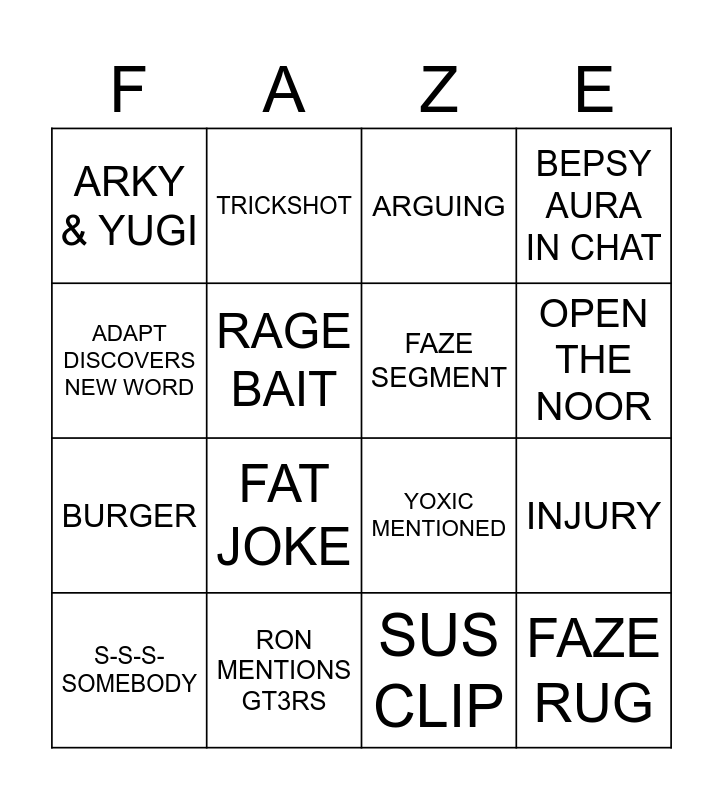 This bingo card has 16 words: RON MENTIONS GT3RS, INJURY, ARGUING, ARKY & YUGI, BURGER, TRICKSHOT, YOXIC MENTIONED, SUS CLIP, ADAPT DISCOVERS NEW WORD, RAGE BAIT, S-S-S- SOMEBODY, BEPSY AURA IN CHAT, FAT JOKE, OPEN THE NOOR, FAZE SEGMENT and FAZE RUG.