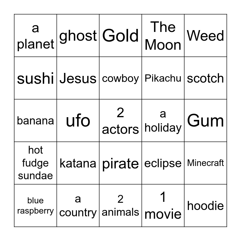 This bingo card has a free space and 24 words: katana, a country, cowboy, blue raspberry, Weed, a planet, sushi, ghost, a holiday, pirate, Pikachu, banana, eclipse, Minecraft, Jesus, 1 movie, Gum, Gold, scotch, ufo, hoodie, hot fudge sundae, The Moon and 2 animals.