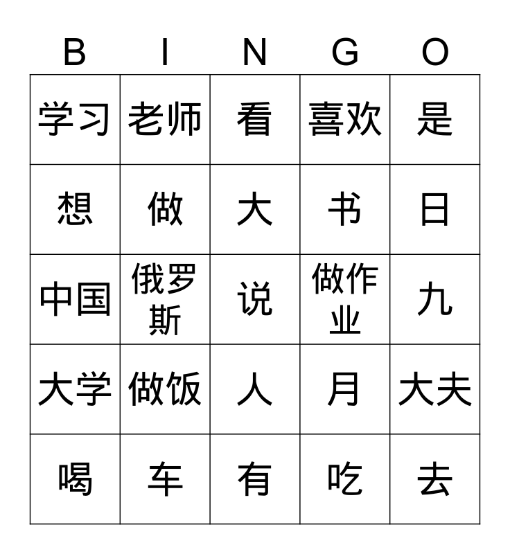 This bingo card has a free space and 24 words: 做饭, 车, 大, 喝, 是, 学习, 想, 老师, 做作业, 人, 书, 中国, 月, 大夫, 做, 吃, 九, 看, 日, 俄罗斯, 去, 大学, 喜欢 and 有.