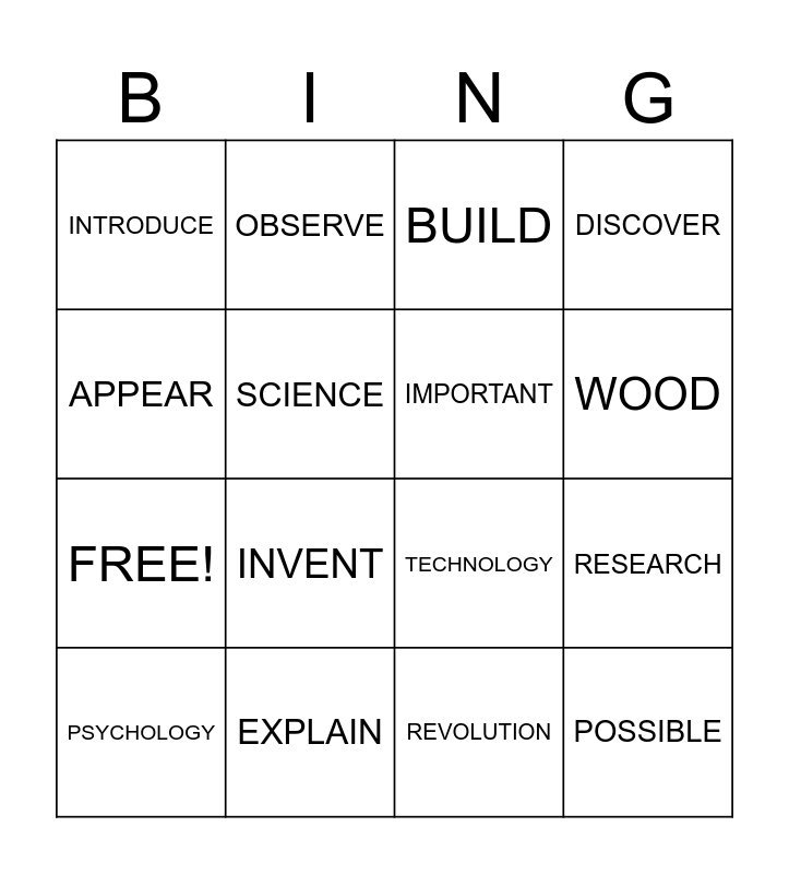 This bingo card has 16 words: EXPLAIN, RESEARCH, BUILD, INTRODUCE, FREE!, OBSERVE, TECHNOLOGY, REVOLUTION, APPEAR, SCIENCE, PSYCHOLOGY, DISCOVER, INVENT, WOOD, IMPORTANT and POSSIBLE.