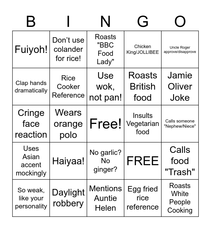This bingo card has a free space and 25 words: Haiyaa!, Mentions Auntie Helen, Use wok, not pan!, So weak, like your personality, Uncle Roger approve/disapprove, Fuiyoh!, Clap hands dramatically, Don’t use colander for rice!, Insults Vegetarian food, No garlic? No ginger?, Roasts British food, Cringe face reaction, FREE, Calls food "Trash", Rice Cooker Reference, MSG Mention, Calls someone "Nephew/Niece", Roasts "BBC Food Lady", Jamie Oliver Joke, Wears orange polo, Roasts White People Cooking, Daylight robbery, Uses Asian accent mockingly, Chicken King/JOLLIBEE and Egg fried rice reference.