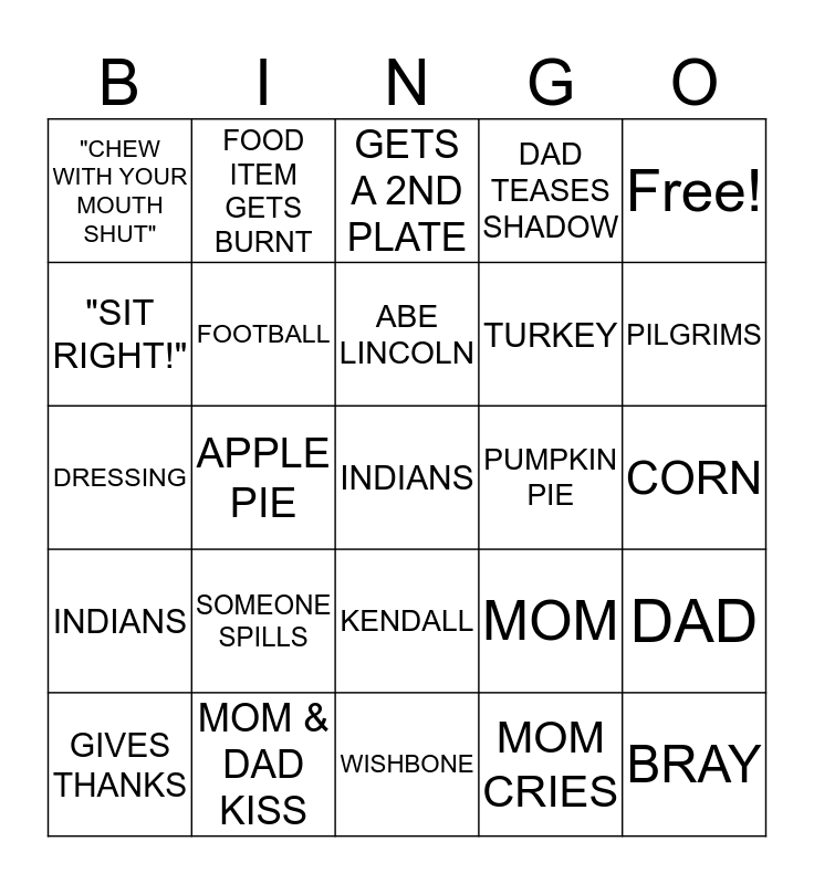 This bingo card has a free space and 24 words: SOMEONE SPILLS, MOM & DAD KISS, ABE LINCOLN, GIVES THANKS, Free!, "CHEW WITH YOUR MOUTH SHUT", "SIT RIGHT!", FOOD ITEM GETS BURNT, PUMPKIN PIE, KENDALL, TURKEY, DRESSING, MOM, DAD, FOOTBALL, MOM CRIES, CORN, GETS A 2ND PLATE, PILGRIMS, APPLE PIE, BRAY, INDIANS, DAD TEASES SHADOW and WISHBONE.