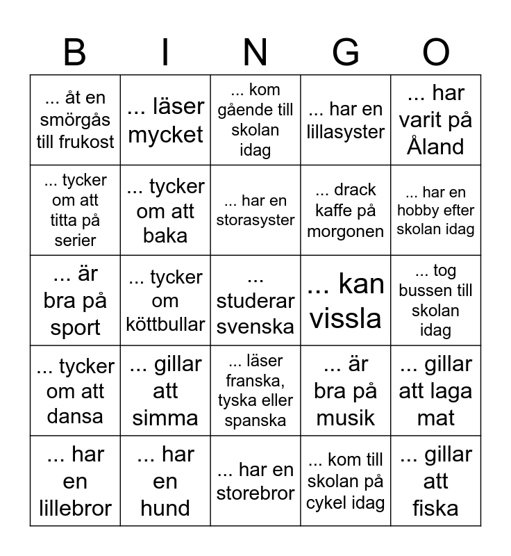 This bingo card has a free space and 24 words: ... gillar att simma, ... har en hund, ... har en storasyster, ... har en lillebror, ... har varit på Åland, ... åt en smörgås till frukost, ... tycker om att titta på serier, ... läser mycket, ... kan vissla, ... läser franska, tyska eller spanska, ... drack kaffe på morgonen, ... är bra på sport, ... är bra på musik, ... gillar att laga mat, ... tycker om att baka, ... kom till skolan på cykel idag, ... tog bussen till skolan idag, ... kom gående till skolan idag, ... har en hobby efter skolan idag, ... tycker om köttbullar, ... gillar att fiska, ... tycker om att dansa, ... har en lillasyster and ... har en storebror.