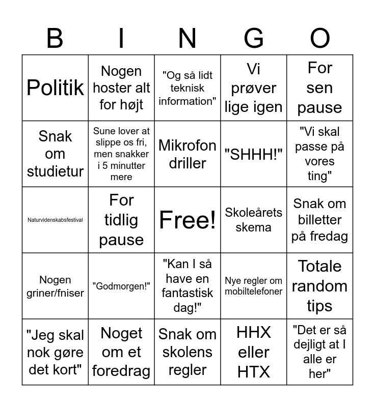 This bingo card has a free space and 25 words: "Godmorgen!", Snak om skolens regler, Mikrofon driller, "Jeg skal nok gøre det kort", For sen pause, Politik, Snak om studietur, Nogen hoster alt for højt, Skoleårets skema, "Kan I så have en fantastisk dag!", "SHHH!", Naturvidenskabsfestival, Nye regler om mobiltelefoner, Totale random tips, Sune lover at slippe os fri, men snakker i 5 minutter mere, Random facts, Snak om billetter på fredag, "Og så lidt teknisk information", "Vi skal passe på vores ting", For tidlig pause, "Det er så dejligt at I alle er her", Noget om et foredrag, Nogen griner/fniser, Vi prøver lige igen and HHX eller HTX.