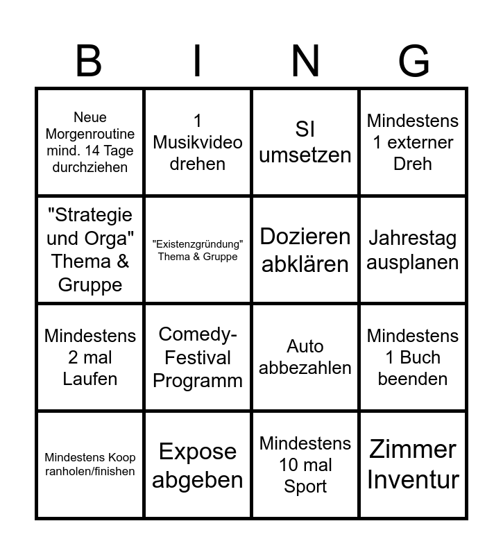 This bingo card has 16 words: Expose abgeben, Mindestens 1 Buch beenden, SI umsetzen, Neue Morgenroutine mind. 14 Tage durchziehen, Mindestens 2 mal Laufen, 1 Musikvideo drehen, Auto abbezahlen, Mindestens 10 mal Sport, "Strategie und Orga" Thema & Gruppe, "Existenzgründung" Thema & Gruppe, Mindestens Koop ranholen/finishen, Mindestens 1 externer Dreh, Comedy-Festival Programm, Jahrestag ausplanen, Dozieren abklären and Zimmer Inventur.