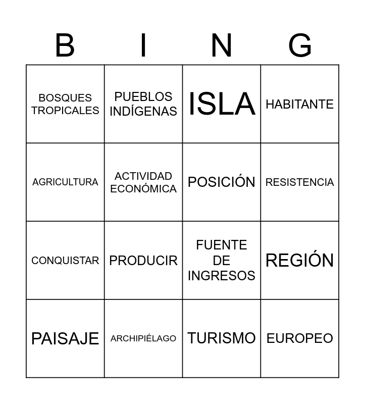 This bingo card has 16 words: ARCHIPIÉLAGO, REGIÓN, ISLA, BOSQUES TROPICALES, CONQUISTAR, PUEBLOS INDÍGENAS, FUENTE DE INGRESOS, TURISMO, AGRICULTURA, ACTIVIDAD ECONÓMICA, PAISAJE, HABITANTE, PRODUCIR, RESISTENCIA, POSICIÓN and EUROPEO.