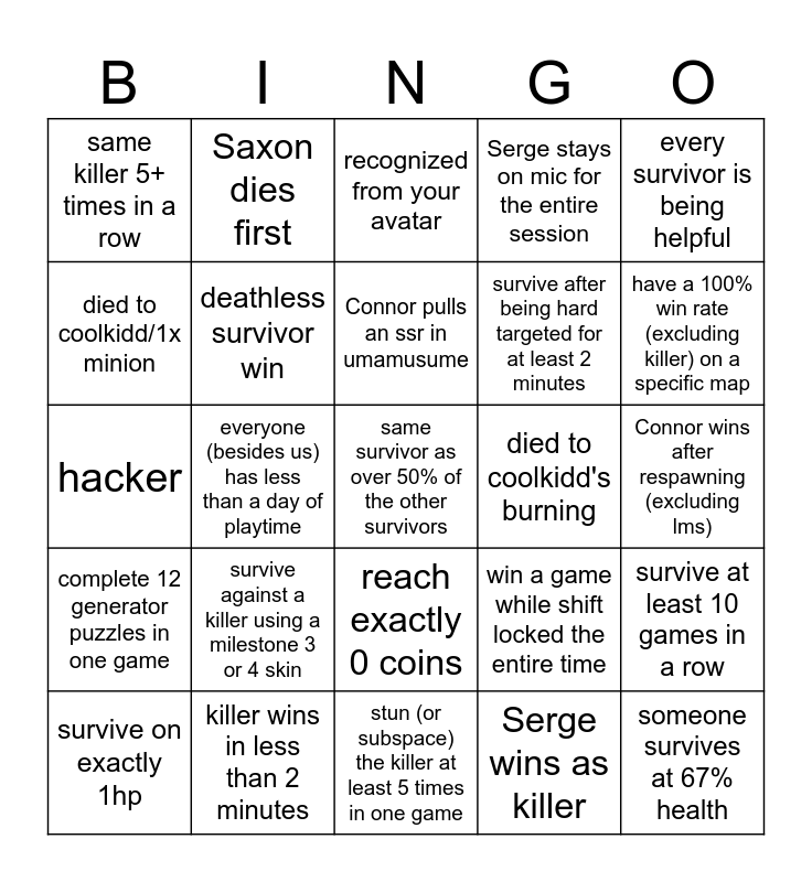 This bingo card has a free space and 24 words: survive against a killer using a milestone 3 or 4 skin, killer wins in less than 2 minutes, Connor pulls an ssr in umamusume, survive on exactly 1hp, every survivor is being helpful, same killer 5+ times in a row, died to coolkidd/1x minion, Saxon dies first, died to coolkidd's burning, reach exactly 0 coins, survive after being hard targeted for at least 2 minutes, hacker, win a game while shift locked the entire time, survive at least 10 games in a row, deathless survivor win, Serge wins as killer, Connor wins after respawning (excluding lms), recognized from your avatar, have a 100% win rate (excluding killer) on a specific map, everyone (besides us) has less than a day of playtime, someone survives at 67% health, complete 12 generator puzzles in one game, Serge stays on mic for the entire session and stun (or subspace) the killer at least 5 times in one game.