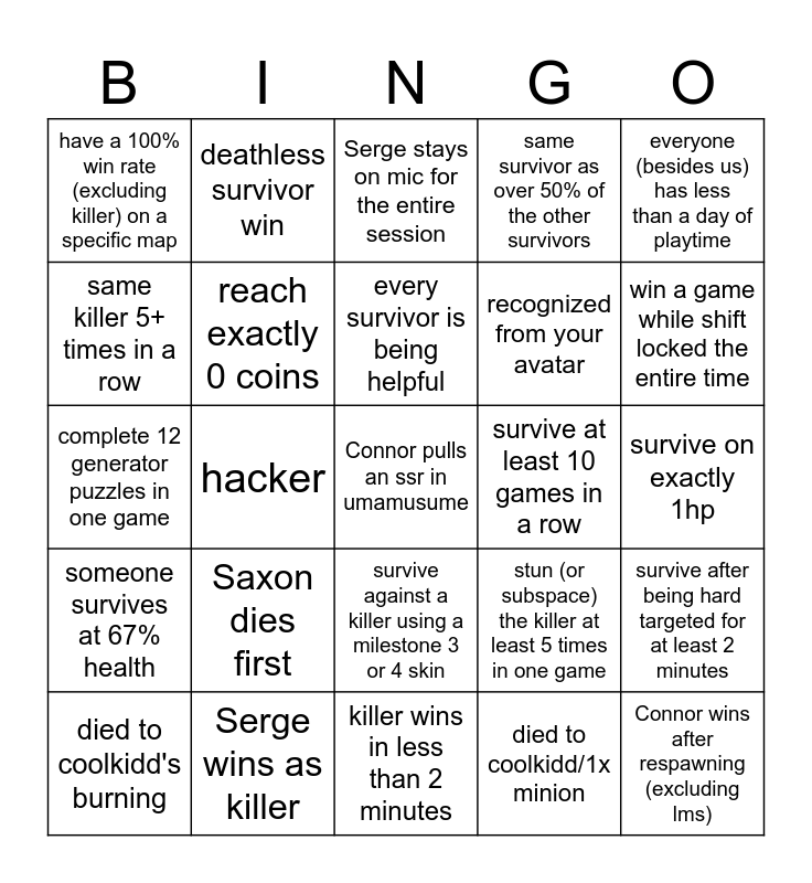 This bingo card has a free space and 24 words: Saxon dies first, Serge wins as killer, every survivor is being helpful, died to coolkidd's burning, everyone (besides us) has less than a day of playtime, have a 100% win rate (excluding killer) on a specific map, same killer 5+ times in a row, deathless survivor win, survive at least 10 games in a row, survive against a killer using a milestone 3 or 4 skin, recognized from your avatar, complete 12 generator puzzles in one game, stun (or subspace) the killer at least 5 times in one game, survive after being hard targeted for at least 2 minutes, reach exactly 0 coins, died to coolkidd/1x minion, survive on exactly 1hp, Serge stays on mic for the entire session, win a game while shift locked the entire time, hacker, Connor wins after respawning (excluding lms), someone survives at 67% health, same survivor as over 50% of the other survivors and killer wins in less than 2 minutes.