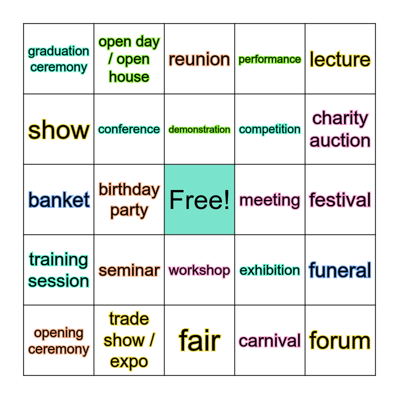This bingo card has a free space and 29 words: opening ceremony, wedding, birthday party, anniversary, graduation ceremony, reunion, conference, seminar, meeting, trade show / expo, festival, forum, fair, carnival, charity auction, marathon, workshop, training session, lecture, banket, exhibition, match, competition, show, performance, open day / open house, funeral, demonstration and flash mob.