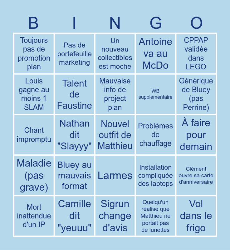 This bingo card has 25 words: Bluey au mauvais format, Sigrun change d'avis, Mauvaise info de project plan, Mort inattendue d'un IP, CPPAP validée dans LEGO, Toujours pas de promotion plan, Louis gagne au moins 1 SLAM, Pas de portefeuille marketing, Problèmes de chauffage, Larmes, WB supplémentaire, Chant impromptu, Installation compliquée des laptops, Clément ouvre sa carte d'anniversaire, Talent de Faustine, Vol dans le frigo, À faire pour demain, Un nouveau collectibles est moche, Générique de Bluey (pas Perrine), Nathan dit "Slayyy", Nouvel outfit de Matthieu, Camille dit "yeuuu", Maladie (pas grave), Antoine va au McDo and Quelqu'un réalise que Matthieu ne portait pas de lunettes.