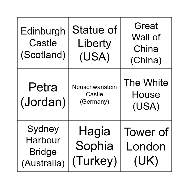 This bingo card has 68 words: Free!, Eiffel Tower (France), Big Ben / Elizabeth Tower (UK), Leaning Tower of Pisa (Italy), Sydney Opera House (Australia), Burj Khalifa (Dubai), Statue of Liberty (USA), Petronas Towers (Malaysia), Hagia Sophia (Turkey), St Peter’s Basilica (Vatican City), Notre Dame Cathedral (France), Buckingham Palace (UK), Windsor Castle (UK), Neuschwanstein Castle (Germany), The Kremlin (Russia), The White House (USA), Palace of Versailles (France), Edinburgh Castle (Scotland), Forbidden City (China), Alhambra (Spain), Tower of London (UK), Grand Canyon (USA), Mount Everest (Nepal/China), Uluru / Ayers Rock (Australia), Niagara Falls (Canada/USA), Victoria Falls (Zimbabwe/Zambia), Mount Fuji (Japan), Mount Kilimanjaro (Tanzania), Angel Falls (Venezuela), Great Barrier Reef (Australia), Great Wall of China (China), Pyramids of Giza (Egypt), Sphinx (Egypt), Colosseum (Italy), Petra (Jordan), Machu Picchu (Peru), Stonehenge (UK), Easter Island Moai (Chile), Chichen Itza (Mexico), Acropolis / Parthenon (Greece), Golden Gate Bridge (USA), Tower Bridge (UK), Sydney Harbour Bridge (Australia), Rialto Bridge (Italy), Charles Bridge (Czech Republic), Christ the Redeemer (Brazil), The Hollywood Sign (USA), Mount Rushmore (USA), Little Mermaid Statue (Denmark), London Eye (UK), Disneyland Castle (USA), Times Square (USA), Las Vegas Strip (USA), Shibuya Crossing (Japan), St Basil’s Cathedral (Russia), Louvre Pyramid (France), Sagrada Familia (Spain), Sky Tower (Auckland), Beehive (Wellington), Lake Taupō, Milford Sound, Mt Cook / Aoraki, Franz Josef Glacier, Cape Reinga Lighthouse, Hobbiton (Matamata), L&P Bottle (Paeroa), Dunedin Railway Station and Cardrona Hotel (Otago).