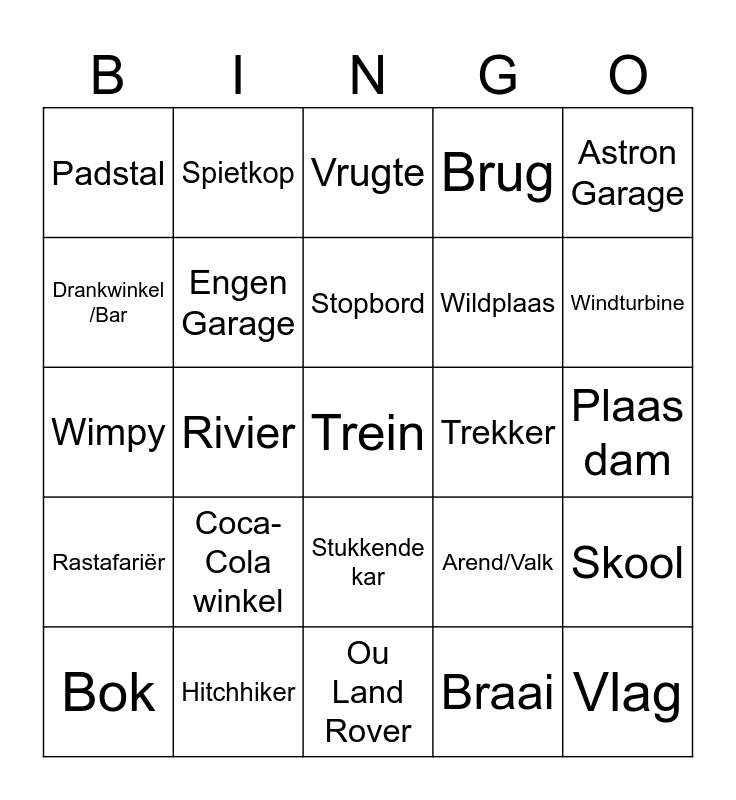 This bingo card has 45 words: Volstruis, Trein, Karavaan, Bok, Hond, Braai, Vrugte, Windpomp, Astron Garage, Hitchhiker, Brug, Trekker, Stukkende kar, Coca-Cola winkel, Kerktoring, Ou Land Rover, Sleepwa, Wimpy, McDonalds, Windturbine, Spietkop, Pothole, Fiets, Padstal, Spoedkamera, Plaas dam, Bloekomboom, Vervalle huis, Arend/Valk, Rastafariër, Volvo, Skool, Geel blomme, Shack, Barbed wire, Rivier, Bank/ATM, Begraafplaas, Vlag, Stopbord, Drankwinkel /Bar, Wildplaas, Brandstof trok, Engen Garage and Oos-Kaapse nommerplaat.