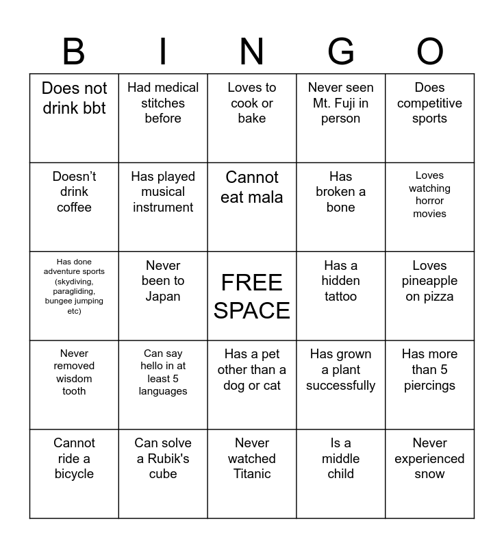 This bingo card has a free space and 24 words: Can say hello in at least 5 languages, Can solve a Rubik's cube, Cannot eat mala, Cannot ride a bicycle, Does competitive sports, Does not drink bbt, Doesn’t drink coffee, Had medical stitches before, Has a hidden tattoo, Has a pet other than a dog or cat, Has broken a bone, Has done adventure sports (skydiving, paragliding, bungee jumping etc), Has grown a plant successfully, Has more than 5 piercings, Has played musical instrument, Is a middle child, Loves pineapple on pizza, Loves to cook or bake, Loves watching horror movies, Never been to Japan, Never experienced snow, Never removed wisdom tooth, Never seen Mt. Fuji in person and Never watched Titanic.