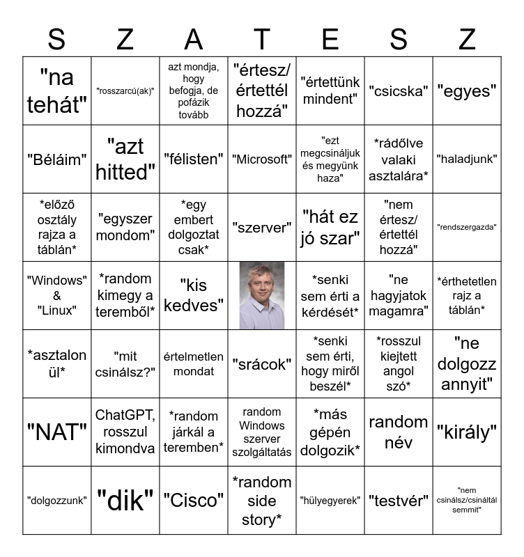 This bingo card has a free space and 48 words: *más gépén dolgozik*, *rádőlve valaki asztalára*, *random side story*, *random kimegy a teremből*, *egy embert dolgoztat csak*, *érthetetlen rajz a táblán*, "rosszarcú(ak)", "dik", "csicska", "srácok", "egyes", "értesz/értettél hozzá", "nem értesz/értettél hozzá", "hát ez jó szar", "NAT", "ne hagyjatok magamra", "Béláim", "haladjunk", random név, "értettünk mindent", "ezt megcsináljuk és megyünk haza", "kis kedves", "na tehát", "azt hitted", "király", "félisten", "rendszergazda", "dolgozzunk", "szerver", "egyszer mondom", "testvér", *senki sem érti a kérdését*, "ne dolgozz annyit", ChatGPT, rosszul kimondva, "Windows" & "Linux", *senki sem érti, hogy miről beszél*, *rosszul kiejtett angol szó*, *előző osztály rajza a táblán*, értelmetlen mondat, *random járkál a teremben*, *asztalon ül*, "nem csinálsz/csináltál semmit", azt mondja, hogy befogja, de pofázik tovább, "Cisco", "Microsoft", random Windows szerver szolgáltatás, "mit csinálsz?" and "hülyegyerek".