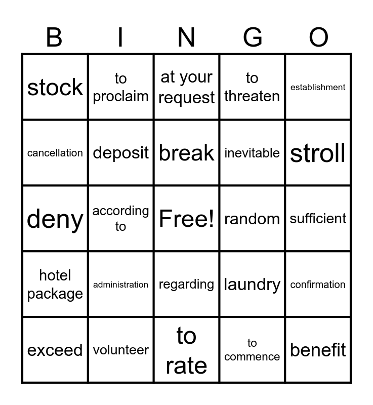 This bingo card has a free space and 24 words: administration, volunteer, break, exceed, establishment, stock, cancellation, to proclaim, random, regarding, inevitable, deny, laundry, confirmation, deposit, to commence, sufficient, at your request, stroll, according to, benefit, hotel package, to threaten and to rate.