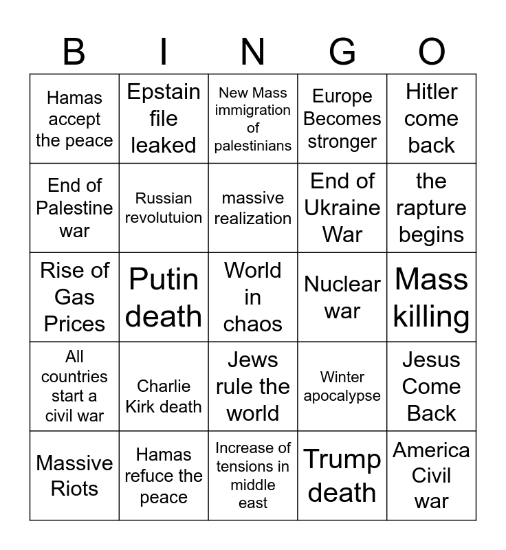 This bingo card has a free space and 24 words: Charlie Kirk death, Hamas refuce the peace, massive realization, Massive Riots, Hitler come back, Hamas accept the peace, End of Palestine war, Epstain file leaked, Nuclear war, Jews rule the world, End of Ukraine War, Rise of Gas Prices, Winter apocalypse, Jesus Come Back, Russian revolutuion, Trump death, Mass killing, New Mass immigration of palestinians, the rapture begins, Putin death, America Civil war, All countries start a civil war, Europe Becomes stronger and Increase of tensions in middle east.
