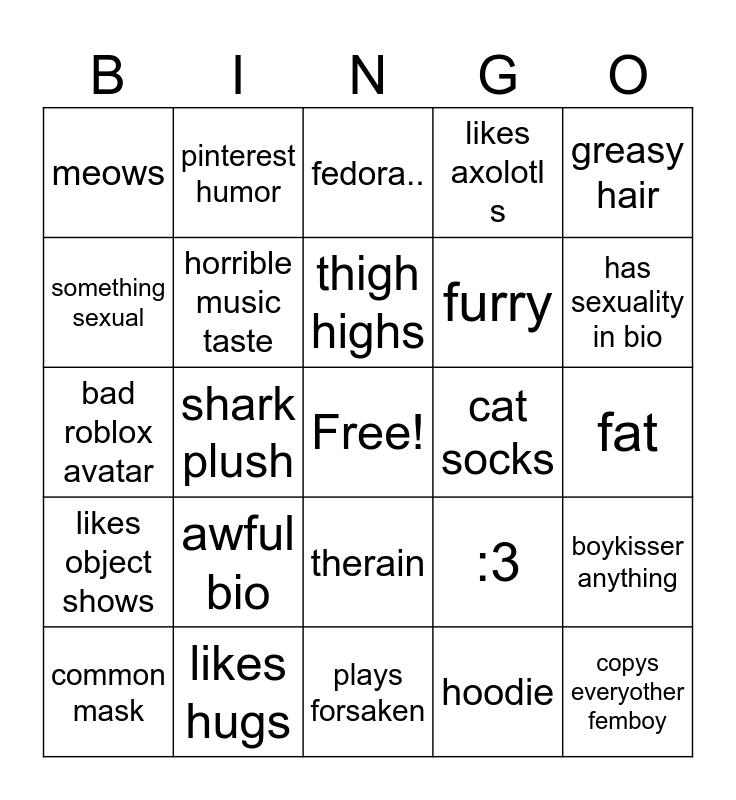 This bingo card has a free space and 24 words: common mask, awful bio, thigh highs, hoodie, greasy hair, meows, pinterest humor, fedora.., cat socks, fat, bad roblox avatar, horrible music taste, :3, boykisser anything, something sexual, likes hugs, plays forsaken, likes axolotl s, has sexuality in bio, likes object shows, shark plush, therain, furry and copys everyother femboy.