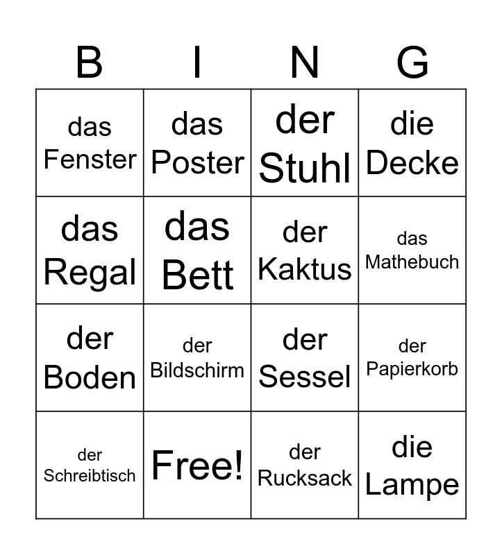 This bingo card has 22 words: Free!, das Bild, das Poster, der Teppich, das Bett, der Kaktus, das Fenster, der Stuhl, der Sessel, die Lampe, der Boden, die Decke, die Tür, der Hund, der Rucksack, die Wand, der Papierkorb, der Schreibtisch, der Bildschirm, das Regal, das Mathebuch and der Schrank.