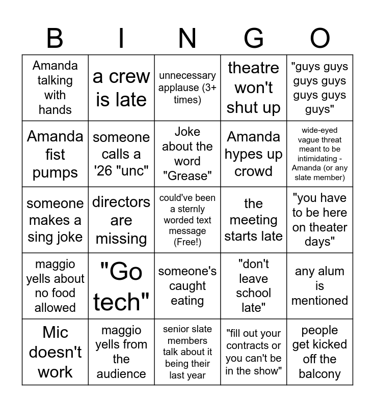 This bingo card has a free space and 24 words: "Go tech", maggio yells from the audience, Joke about the word "Grease", Mic doesn't work, "guys guys guys guys guys guys guys", Amanda talking with hands, Amanda fist pumps, a crew is late, the meeting starts late, someone's caught eating, Amanda hypes up crowd, someone makes a sing joke, "don't leave school late", any alum is mentioned, someone calls a '26 "unc", "fill out your contracts or you can't be in the show", "you have to be here on theater days", unnecessary applause (3+ times), wide-eyed vague threat meant to be intimidating -Amanda (or any slate member), directors are missing, people get kicked off the balcony, maggio yells about no food allowed, theatre won't shut up and senior slate members talk about it being their last year.