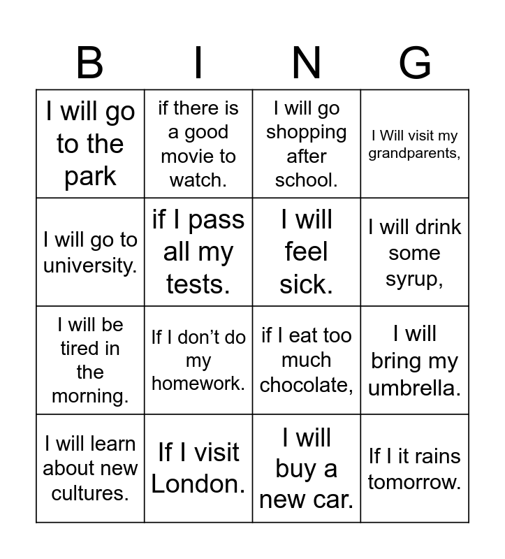 This bingo card has 19 words: if I eat too much chocolate,, I will pass the test., I will go shopping after school., If I it rains tomorrow., I will bring my umbrella., I will go to university., I will buy a new car., I will go to the park, if there is a good movie to watch., I will be tired in the morning., If I don’t do my homework., if I pass all my tests., I will feel sick., If I visit London., I will learn about new cultures., if I win in the lottery,, I Will visit my grandparents,, I will drink some syrup, and I will be happier,.