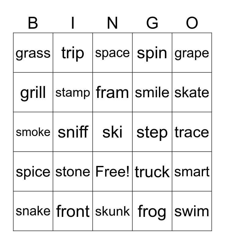 This bingo card has 26 words: Free!, frog, fram, front, grape, grass, grill, trip, trace, truck, smile, smoke, smart, snake, sniff, snack, spin, spice, space, ski, skate, skunk, step, stone, stamp and swim.