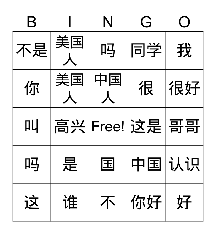 This bingo card has a free space and 24 words: 是, 谁, 中国人, 这, 我, 不是, 你, 美国人, 这是, 国, 很, 叫, 中国, 认识, 美国人, 你好, 哥哥, 吗, 很好, 高兴, 好, 吗, 同学 and 不.