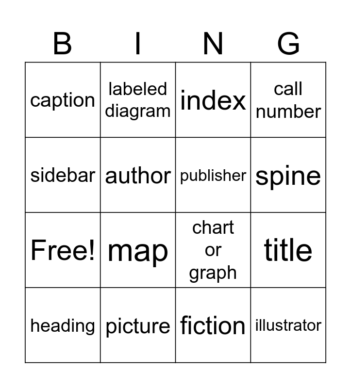 This bingo card has 20 words: title, table of contents, index, glossary, heading, sidebar, picture, caption, Free!, labeled diagram, map, chart or graph, author, illustrator, publisher, photo credit, spine, call number, fiction and nonfiction.
