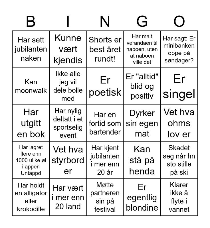 This bingo card has 35 words: Har en fortid som hårmodell, Kan chugge et helt glass øl uten pauser, Sier: Hest er best mellom beina, Ikke alle jeg vil dele bolle med, Har kjent jubilanten i mer enn 20 år, Har malt verandaen til naboen, uten at naboen ville det, Kan moonwalk, Skal gifte seg!, Er poetisk, Bussjåføren ble skutt når hn reiste alene som barn, Har utgitt en bok, Har sagt: Er minibanken oppe på søndager?, Liker ikke sushi, Har ringt en venn for å få fjernet en edderkopp, Har sett jubilanten naken, Dyrker sin egen mat, Er egentlig blondine, Har nylig deltatt i et sportselig event, Har lagret flere enn 1000 ulike øl i appen Untappd, Har en fortid som bartender, Kan stå på henda, Har holdt en alligator eller krokodille, Skadet seg når hn sto stille på ski, Har vært i mer enn 20 land, Shorts er best året rundt!, Er singel, Klarer ikke å flyte i vannet, Vegeterianer som er dyktig på å steke biff, Er "alltid" blid og positiv, Vet hva ohms lov er, Baileys!, Møtte partneren sin på festival, Vet hva styrbord er, Kunne vært kjendis and Kjenner en A-kjendis.