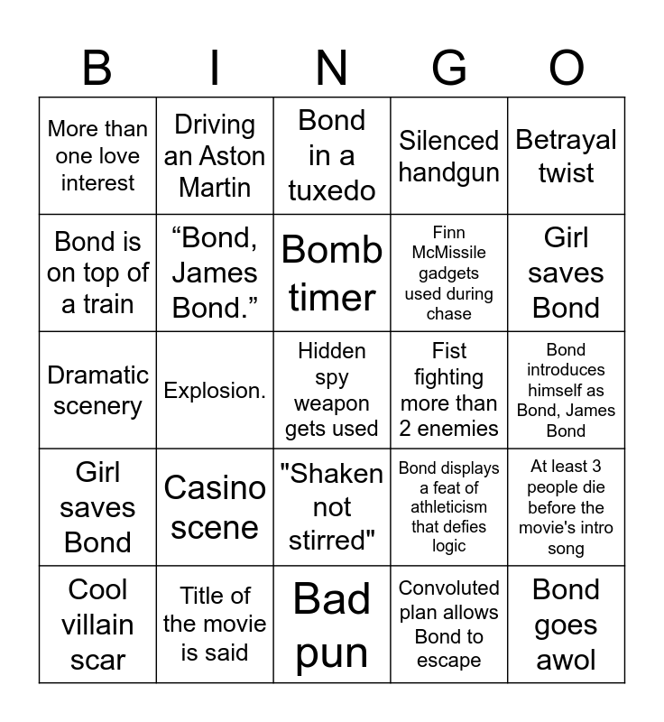 This bingo card has a free space and 24 words: Casino scene, Title of the movie is said, Bomb timer, Cool villain scar, Betrayal twist, More than one love interest, Bond is on top of a train, Driving an Aston Martin, Fist fighting more than 2 enemies, "Shaken not stirred", Finn McMissile gadgets used during chase, Dramatic scenery, Bond displays a feat of athleticism that defies logic, At least 3 people die before the movie's intro song, “Bond, James Bond.”, Convoluted plan allows Bond to escape, Bond introduces himself as Bond, James Bond, Bond in a tuxedo, Girl saves Bond, Explosion., Bond goes awol, Girl saves Bond, Silenced handgun and Bad pun.