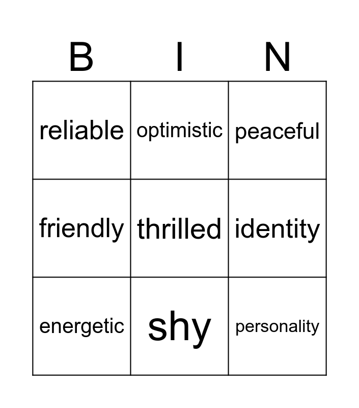 This bingo card has a free space and 8 words: identity, peaceful, optimistic, energetic, reliable, personality, friendly and shy.