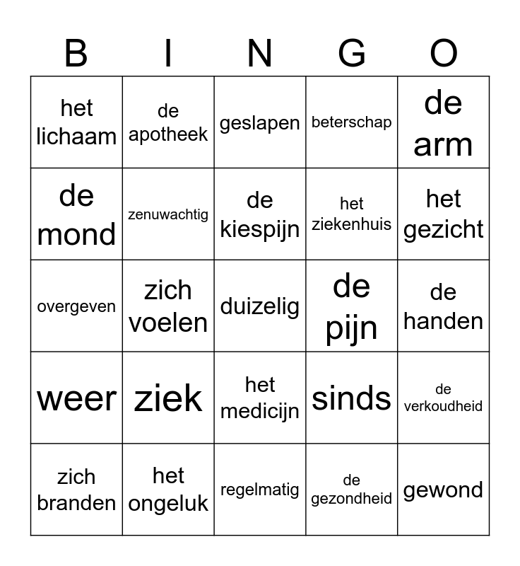 This bingo card has a free space and 24 words: ziek, het ongeluk, de kiespijn, zich branden, de arm, het lichaam, de mond, de apotheek, de pijn, het medicijn, het ziekenhuis, overgeven, sinds, de verkoudheid, zenuwachtig, de gezondheid, de handen, geslapen, het gezicht, zich voelen, gewond, weer, beterschap and regelmatig.