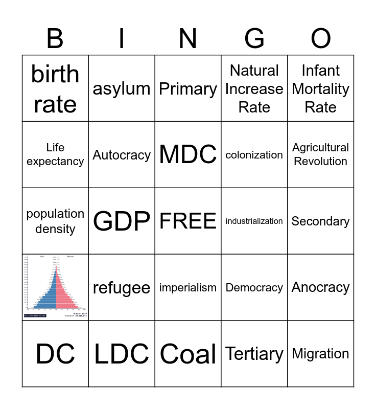This bingo card has 1 images, a free space and 23 words: refugee, LDC, MDC, DC, Infant Mortality Rate, birth rate, Life expectancy, asylum, industrialization, imperialism, colonization, population density, Democracy, Anocracy, Autocracy, Tertiary, Secondary, Primary, Agricultural Revolution, GDP, Migration, Natural Increase Rate and Coal.