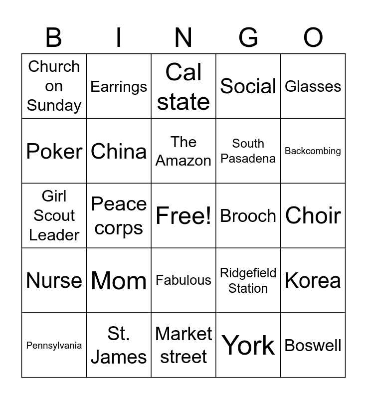 This bingo card has a free space and 54 words: Black and white, Nurse, Big smile, Red lipstick, Fabulous, Book club, Social, Professor, Poker, Engaging, Church on Sunday, California, St. James, Pennsylvania, Emory university, Market street, Boswell, South Pasadena, Dean, Choir, Ridgefield Station, Flores de Oro, Brooch, Glasses, Owls, Earrings, Turtleneck, Sweaters, Snazzy, York, Friend, Red Nails, Great dancer, World traveler, Cal state, Mexican food, Girl Scout Leader, Korea, Brazil, China, England, Italy, Sister, Aunt, Mom, Grandma, Spain, Ocelot, The Amazon, Peace corps, Backcombing, Feisty, Diet Coke and Lucky.