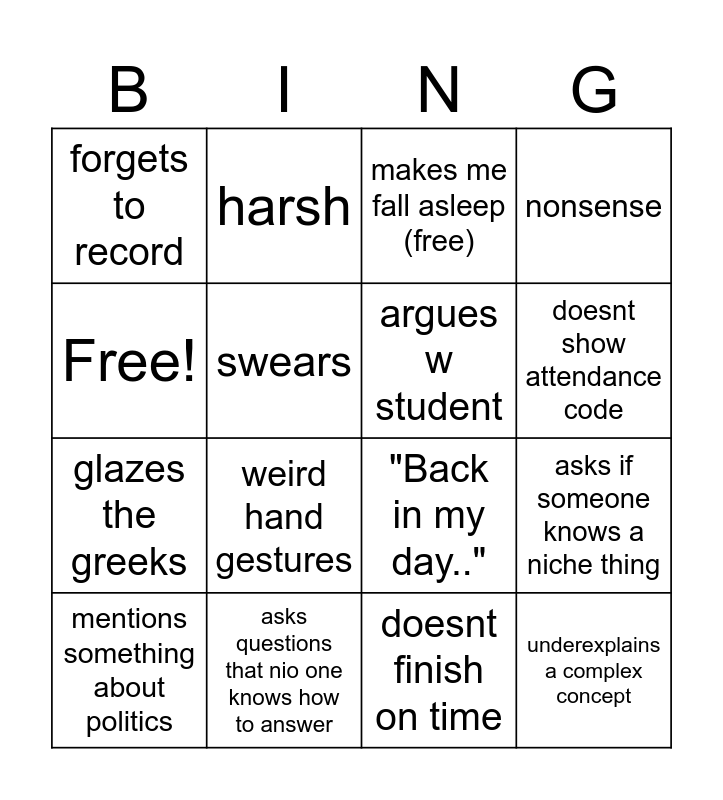 This bingo card has 16 words: asks questions that nio one knows how to answer, asks if someone knows a niche thing, makes me fall asleep (free), forgets to record, glazes the greeks, harsh, "Back in my day..", doesnt finish on time, Free!, swears, mentions something about politics, nonsense, weird hand gestures, doesnt show attendance code, argues w student and underexplains a complex concept.