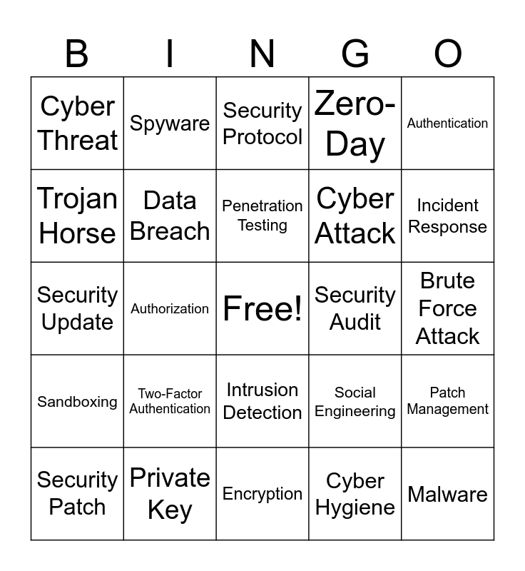 This bingo card has a free space and 50 words: Phishing, Malware, Firewall, Encryption, Two-Factor Authentication, VPN, Spyware, Ransomware, Trojan Horse, Antivirus, Data Breach, Zero-Day, Patch Management, Social Engineering, Botnet, DDoS Attack, Penetration Testing, Security Audit, Access Control, Authentication, Authorization, Cyber Hygiene, Cyber Threat, Cyber Attack, Cybersecurity Policy, Security Awareness, Incident Response, Risk Assessment, Security Protocol, Intrusion Detection, Intrusion Prevention, Security Token, Digital Certificate, Public Key, Private Key, SSL/TLS, Secure Socket, Rootkit, Keylogger, Brute Force Attack, SQL Injection, Cross-Site Scripting, Man-in-the-Middle, Session Hijacking, Security Patch, Security Update, Security Vulnerability, Exploit, Sandboxing and Network Security.
