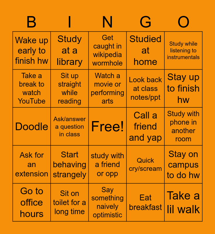 This bingo card has a free space and 24 words: Go to office hours, Start behaving strangely, Watch a movie or performing arts, Eat breakfast, Study while listening to instrumentals, Wake up early to finish hw, Study at a library, Get caught in wikipedia wormhole, Call a friend and yap, Study with phone in another room, Doodle, Sit up straight while reading, Quick cry/scream, Stay on campus to do hw, Take a break to watch YouTube, Sit on toilet for a long time, Say something naively optimistic, Studied at home, Stay up to finish hw, Ask for an extension, Ask/answer a question in class, study with a friend or opp, Look back at class notes/ppt and Take a lil walk.