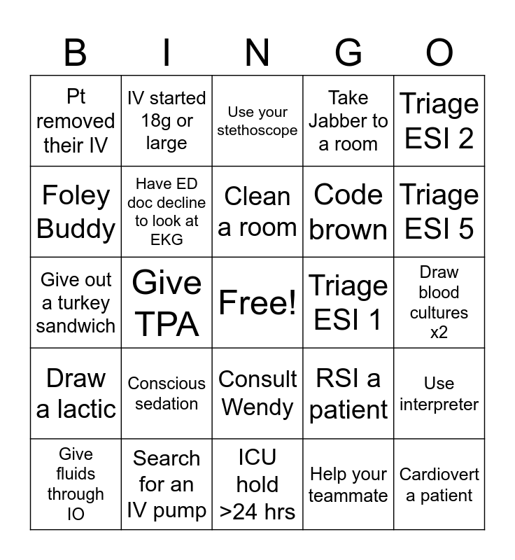 This bingo card has a free space and 51 words: Start an IV, Cardiovert a patient, Perform chest compressions, ICU hold >24 hrs, Conscious sedation, Assist w/ reduction, IV started 18g or large, Insert foley, Foley Buddy, Perform EKG, Have ED doc decline to look at EKG, Take Jabber to a room, Use interpreter, RSI a patient, Assist w/ intubation, Don full PPE, Clean a room, Triage ESI 1, Insert NG/OG, Triage ESI 2, Give TPA, Help your teammate, Pt removed their IV, Code brown, Code stroke, STEMI, Triage ESI 5, Nurse refuses your report, Give fluids through IO, Use your stethoscope, Use telepsych, Tell charge you can take an extra pt, Check in EMS pt, Forget to bring something into isolation room, Utilize 3 IV channels at once, Search for an IV pump, Care for pt w/ foreign body, Access a port, Give Insulin, Assist patient to vehicle, Draw blood cultures x2, Draw a lactic, GBS reads HI, Patient from PEAK, Pick up extra shift in Flexwork, Fly a patient out, Give out a turkey sandwich, Patient from Currituck, Give Narcan, Consult Wendy and Take down a critical result from lab.