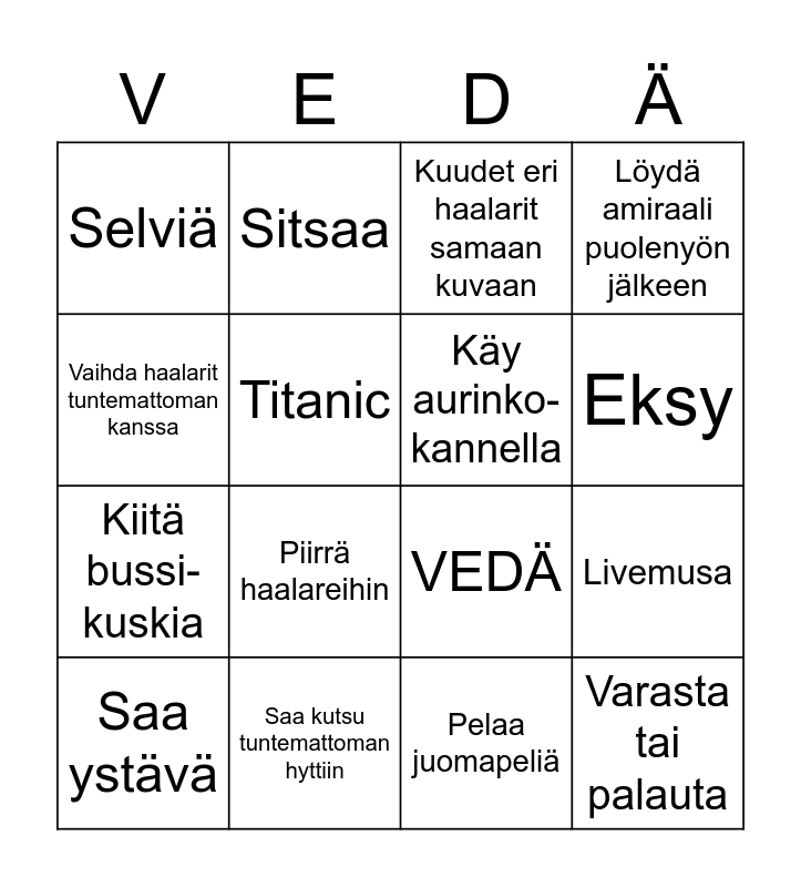 This bingo card has 16 words: Saa kutsu tuntemattoman hyttiin, Livemusa, Kuudet eri haalarit samaan kuvaan, Selviä, Kiitä bussi-kuskia, Sitsaa, VEDÄ, Pelaa juomapeliä, Vaihda haalarit tuntemattoman kanssa, Titanic, Saa ystävä, Löydä amiraali puolenyön jälkeen, Piirrä haalareihin, Eksy, Käy aurinko-kannella and Varasta tai palauta.