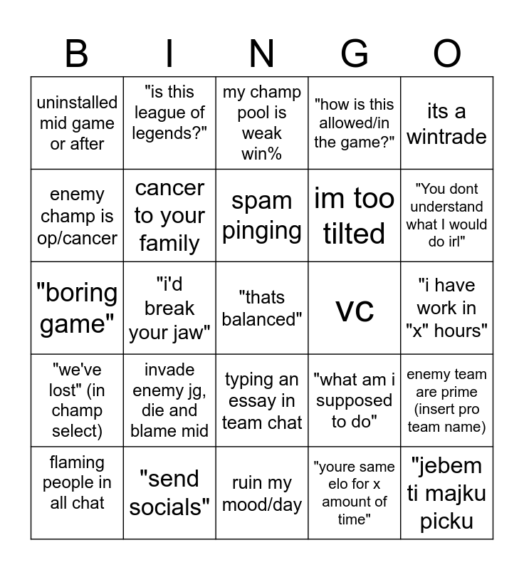 This bingo card has 25 words: invade enemy jg, die and blame mid, ruin my mood/day, spam pinging, flaming people in all chat, its a wintrade, uninstalled mid game or after, enemy champ is op/cancer, "is this league of legends?", vc, typing an essay in team chat, im too tilted, "boring game", "what am i supposed to do", enemy team are prime (insert pro team name), cancer to your family, "jebem ti majku picku, "i have work in "x" hours", my champ pool is weak win%, "You dont understand what I would do irl", "i'd break your jaw", "thats balanced", "send socials", "we've lost" (in champ select), "how is this allowed/in the game?" and "youre same elo for x amount of time".