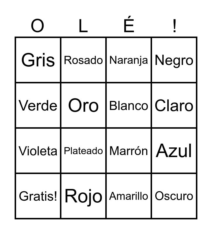 This bingo card has 16 words: Rojo, Azul, Naranja, Gris, Violeta, Rosado, Marrón, Amarillo, Verde, Oro, Gratis!, Negro, Plateado, Claro, Blanco and Oscuro.
