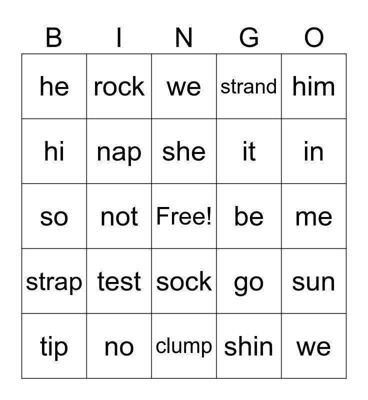 This bingo card has a free space and 27 words: go, bat, it, clump, hi, we, rock, strap, be, sun, so, strand, tip, no, in, step, nap, she, test, he, me, shin, not, we, sock, him and set.