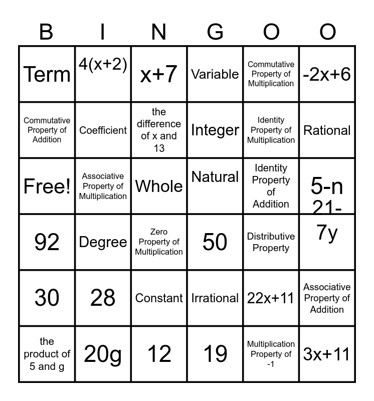 This bingo card has 36 words: Irrational, Constant, 19, Commutative Property of Addition, 92, Natural, Coefficient, 12, Commutative Property of Multiplication, 22x+11, Rational, Variable, Associative Property of Addition, Associative Property of Multiplication, Integer, Term, 30, Identity Property of Addition, Free!, x+7, Whole, Degree, 50, Zero Property of Multiplication, Distributive Property, 4(x+2), Identity Property of Multiplication, 20g, the difference of x and 13, -2x+6, 3x+11, the product of 5 and g, 21-7y, 5-n, 28 and Multiplication Property of -1.