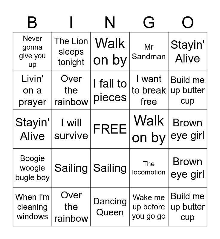 This bingo card has a free space and 48 words: I want to break free, Build me up butter cup, When I'm cleaning windows, Dancing Queen, Sailing, Boogie woogie bugle boy, The Lion sleeps tonight, Purple Rain, Livin' on a prayer, We'll meet again, Over the rainbow, Mr Sandman, Brown eye girl, The locomotion, Under the boardwalk, Good vibrations, I fall to pieces, Walk on by, Close to you, Stayin' Alive, I will survive, Wake me up before you go go, Never gonna give you up, I want to break free, I want to break free, Build me up butter cup, When I'm cleaning windows, Dancing Queen, Sailing, Boogie woogie bugle boy, The Lion sleeps tonight, Purple Rain, Livin' on a prayer, We'll meet again, Over the rainbow, Mr Sandman, House of the rising sun, Brown eye girl, The locomotion, Under the boardwalk, Good vibrations, I fall to pieces, Walk on by, Close to you, Stayin' Alive, I will survive, Wake me up before you go go and Never gonna give you up.