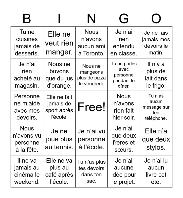 This bingo card has a free space and 24 words: Je ne joue plus au tennis., Elle ne va plus au café après l’école., Nous ne mangeons plus de pizza le vendredi., Il ne va jamais au cinéma le weekend., Je ne fais jamais mes devoirs le matin., Tu ne cuisines jamais de desserts., Je n’ai rien acheté au magasin., Elle ne veut rien manger., Nous n’avons rien fait hier soir., Je n’ai vu personne à l’école., Tu ne parles avec personne pendant le dîner., Personne ne m’aide avec mes devoirs., Je n’ai que deux frères et sœurs., Elle n’a que deux stylos., Nous ne buvons que du jus d’orange., Je n’ai aucune idée pour le projet., Tu n’as aucun message sur ton téléphone., Nous n’avons aucun ami à Toronto., Il n’y a plus de lait dans le frigo., Elle ne fait jamais de sport après l’école., Je n’ai lu aucun livre cet été., Nous n’avons vu personne à la fête., Je n’ai rien entendu en classe. and Tu n’as plus tes devoirs dans ton sac..