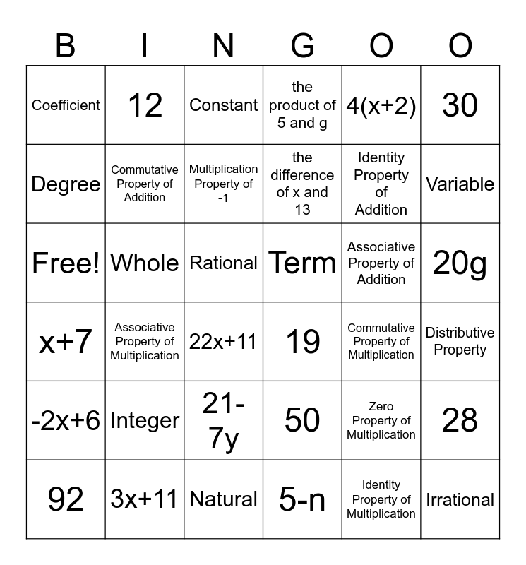 This bingo card has 36 words: 50, 21-7y, 5-n, Degree, x+7, Term, Commutative Property of Addition, Natural, 4(x+2), Zero Property of Multiplication, Variable, the product of 5 and g, 28, Whole, the difference of x and 13, Coefficient, -2x+6, Associative Property of Addition, Free!, Constant, Rational, Associative Property of Multiplication, 19, 22x+11, Commutative Property of Multiplication, 12, Identity Property of Addition, 3x+11, Multiplication Property of -1, 30, Irrational, 92, Distributive Property, 20g, Integer and Identity Property of Multiplication.